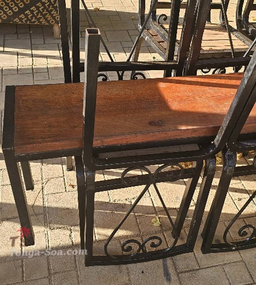 Tables en fer et bois Une table 210 x 70 et cinq tables 120 x 70Chaises et bancs fer bois assortie. 💌 Répondre à cette annonce